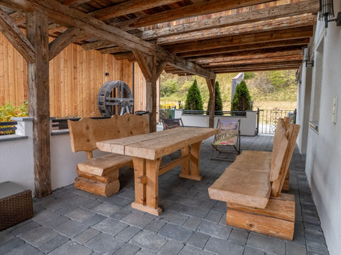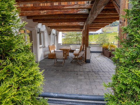 überdachte Terrasse (ca. 22m²) mit Gartenmöbeln / Sonnenschirm