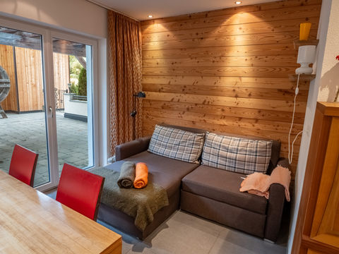 Wohnbereich mit gemütlicher Essecke und ausziehbarer Schlafcouch